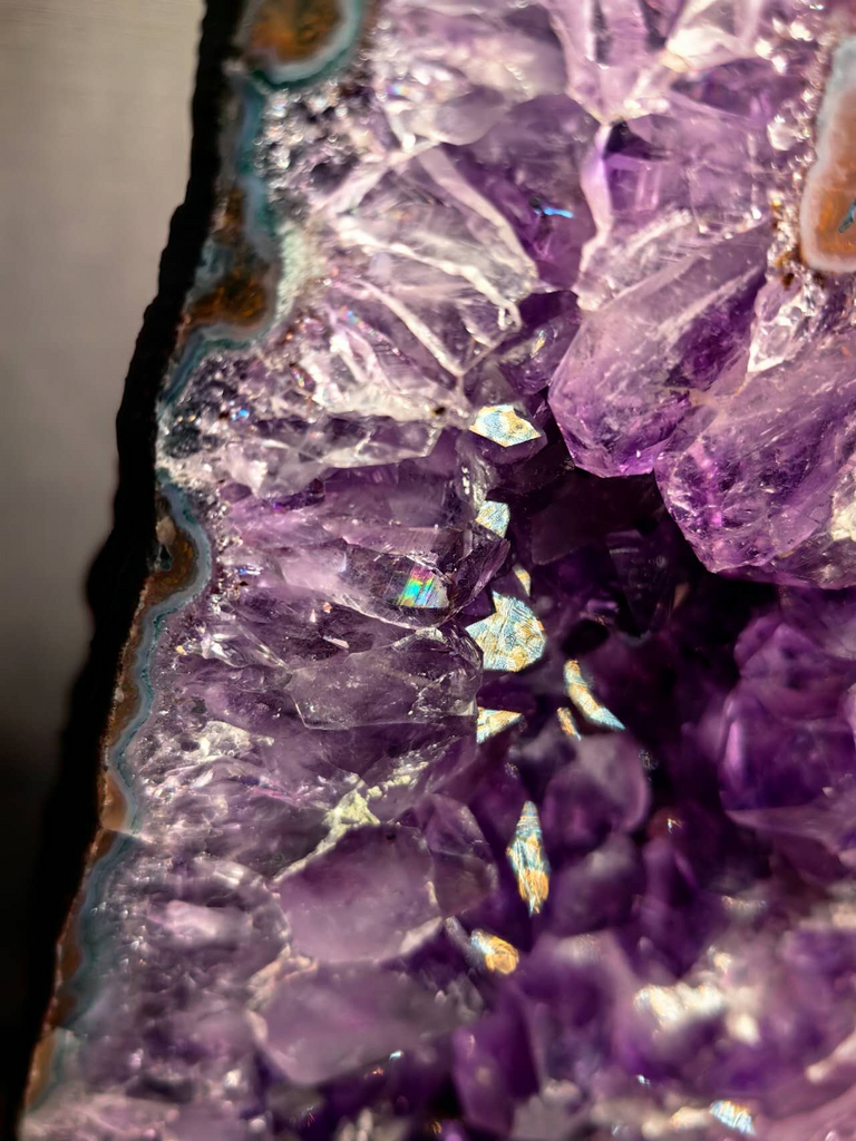 Brazilian Amethyst Geode, a stunning natural spectacle with vibrant purple crystals and striking rainbow inclusions. Each geode is a unique treasure, sculpted over millennia beneath the earth, making it not just a decorative piece but a slice of ancient history.